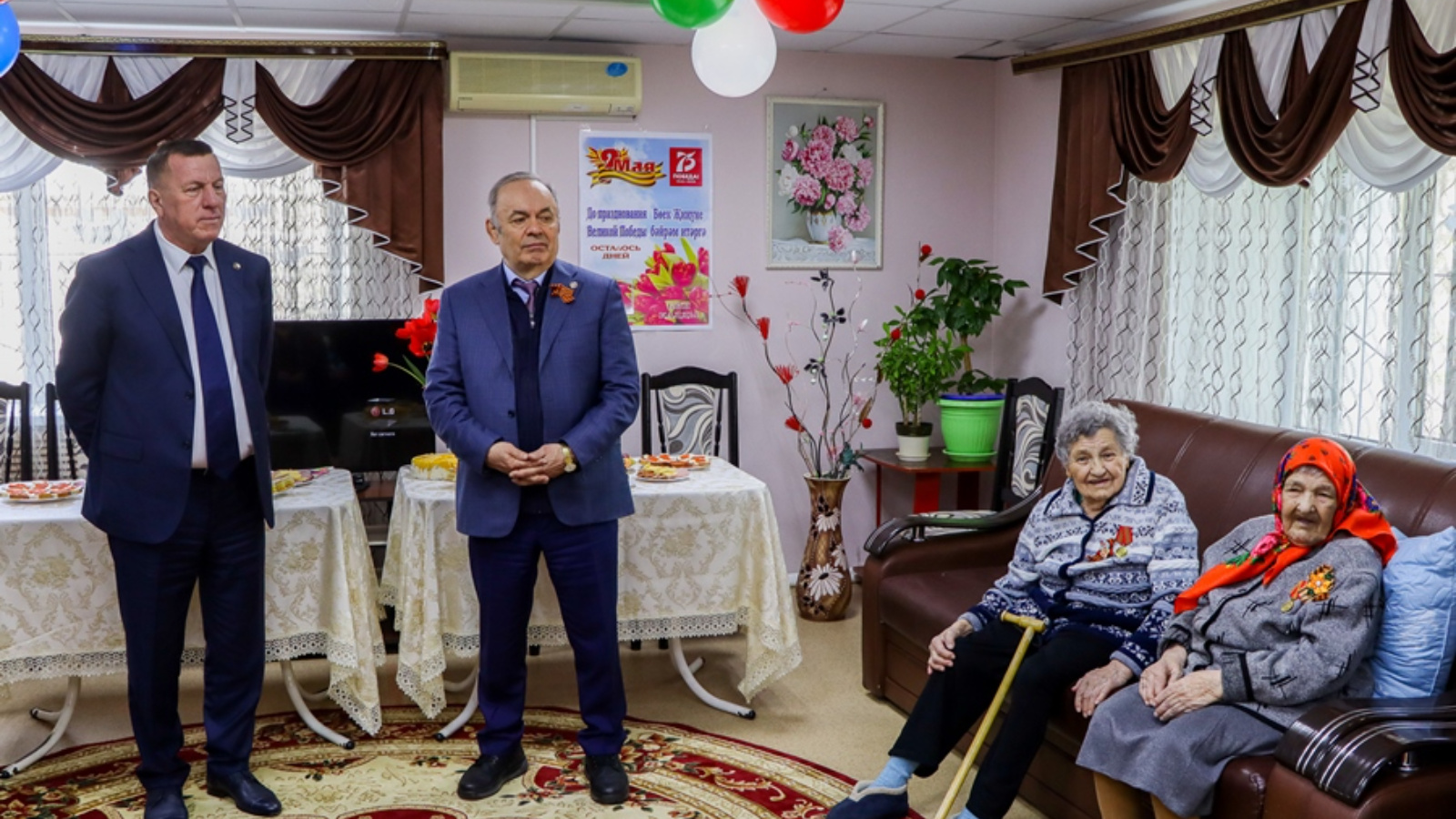 В День Победы Глава района Рамис Хатыпович Сафиуллов и Председатель Ассоциации "Совет муниципальных образований Республики Татарстан" Экзам Саматович Губайдуллин посетили Тетюшский дом-интернат для престарелых и инвалидов.