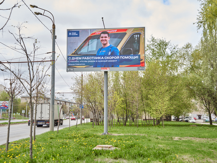 Ко Дню работника скорой медицинской помощи на десяти наружных билбордах столицы Татарстана разместили фотографии семи фельдшеров и одного водителя машины медслужбы.На стендах горожане могут увидеть фельдшеров бригады скорой помощи Казани: Илью Зуйкова, Андрея Зайцева, Гульгену Сафиуллину, Елену Митрофанову, Александру Любимову, Людмилу Апаеву, Ильназа Сафиуллина, а также водителя Фаиля Шамсутдинова.