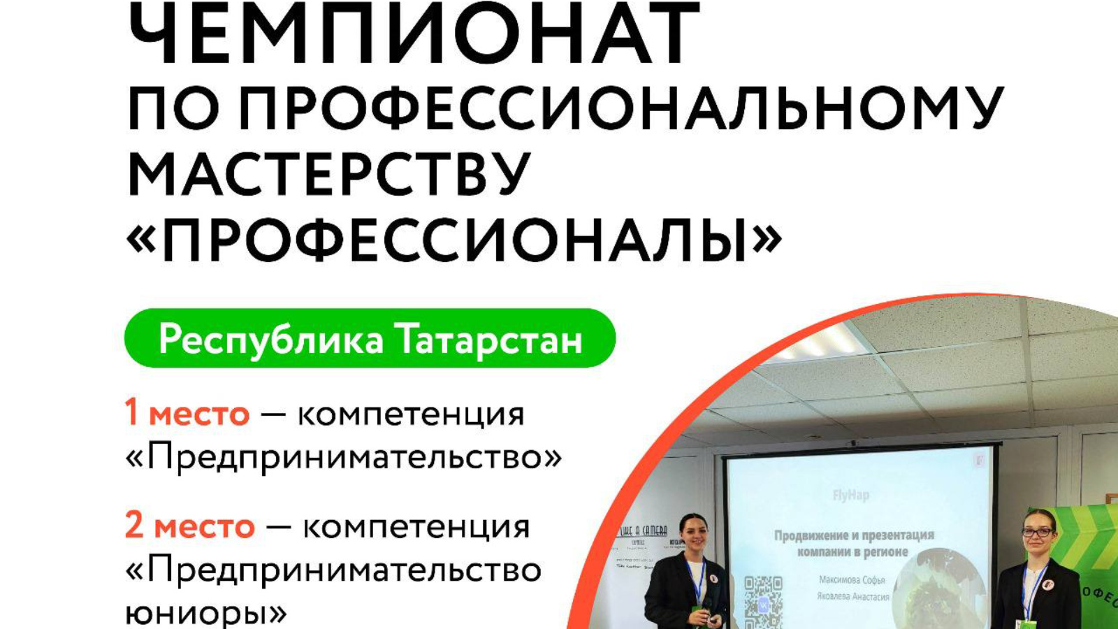Основной состав победителей компетенции «Предпринимательство» - Софья Максимова и Анастасия Яковлева , студентки ГАПОУ «Казанский торгово-экономического техникума». Их бизнес-проект «FlyHap» про создание букетов из искусственных бабочек и растений.