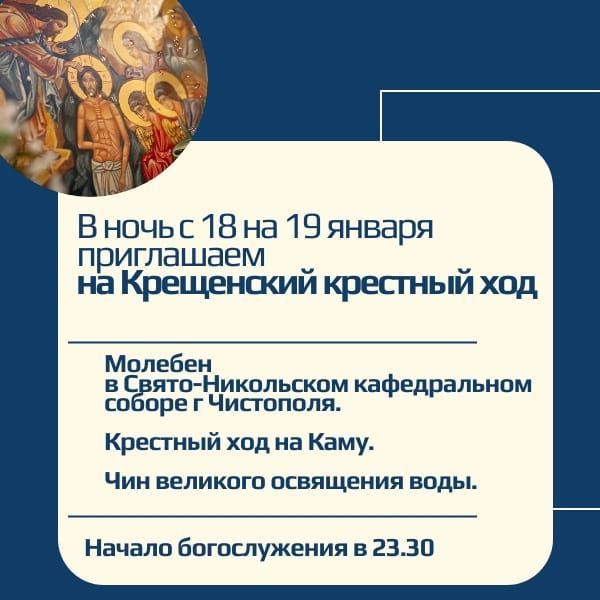 Так, в ночь с 18 на 19 января в чистопольском Свято-Никольском соборе 23.30 пройдет молебен. После богослужения верующие выйдут из собора крестным ходом на Каму, где пройдет Чин великого освящения воды.