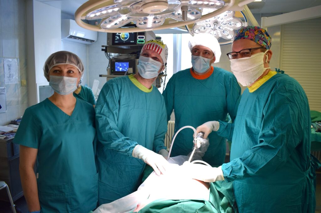Заместитель главного врача Александр Киршин и заведующий 2 торакальным отделением Том Шарапов выполнили лапароскопическую резекцию желудка по поводу начальной стадии рака у пациентки.